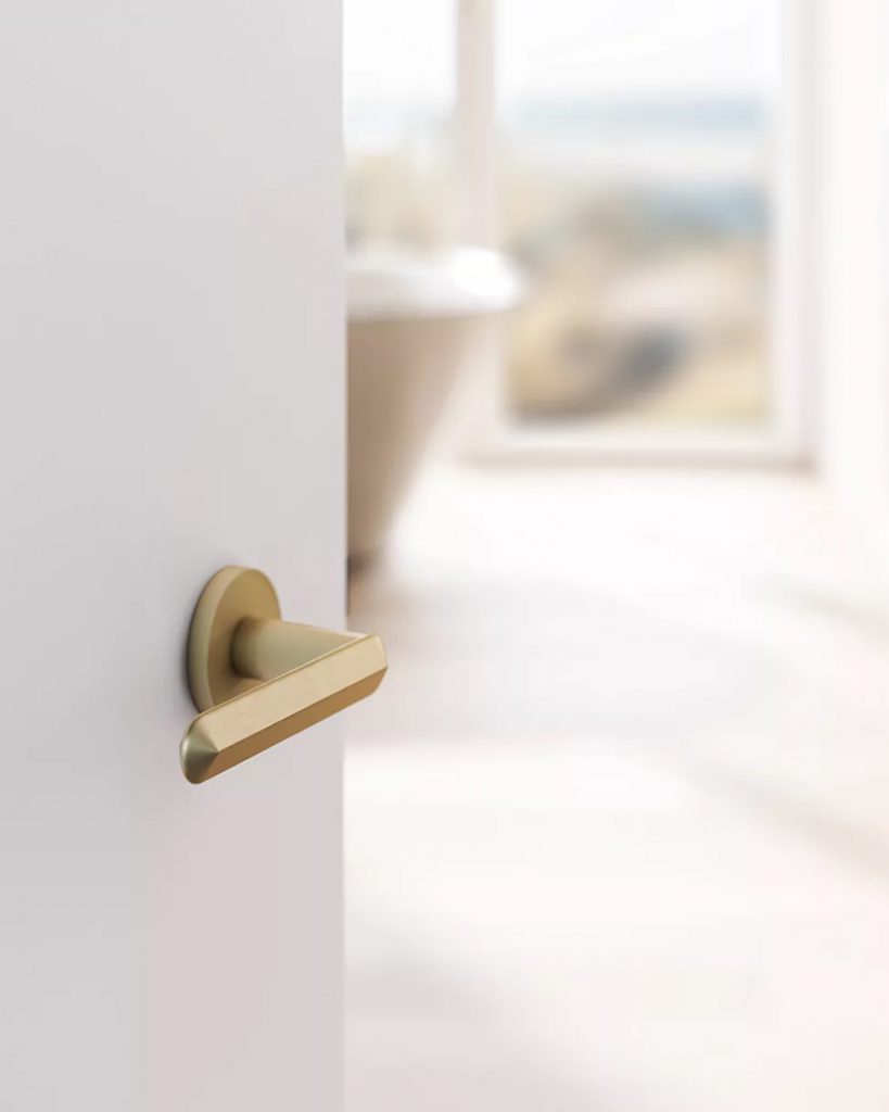 - Piezas que combinan estética y funcionalidad: sofás, sillones y mobiliario de gran volumen se convierten en protagonistas de la estancia. Ejemplos de herrajes que con sus formas y ángulos acompañan esta tendencia son las manillas Sky de Olivari.
